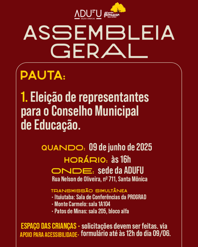 A Diretoria Executiva da ADUFU, Gestão Florescer nas Lutas, convoca sindicalizadas e sindicalizados para Assembleia Geral, que será realizada no dia 09 de junho de 2025, segunda-feira, às 16h.